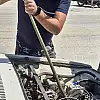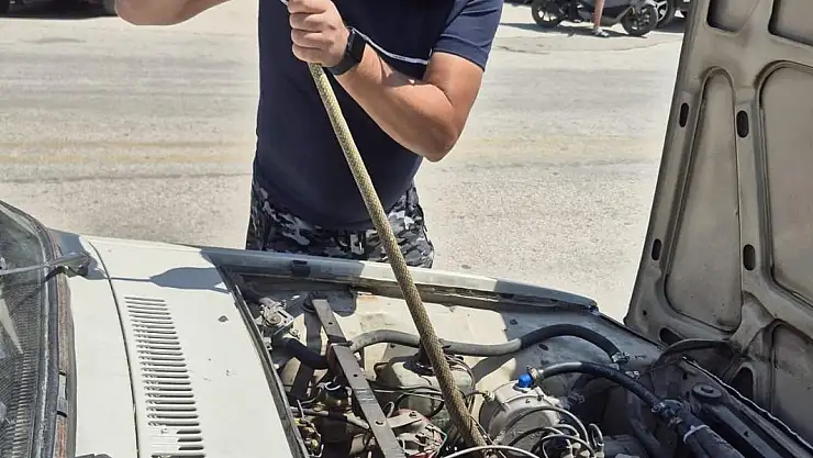 Otomobilin motoruna giren yılanı sopayla çıkardı