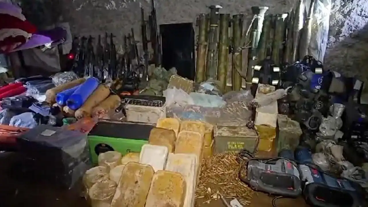 "10 AK-47 piyade tüfeği, 2 M-16 piyade tüfeği, 7,62 milimetre PKMS makineli tüfek, 7 AT-4 tanksavar silahı, RPG-7 roketatar, 60 misket tipi el bombası, 3 RPG-7 tanksavar mühimmatı, 30 bağ bombaatar mühimmatı, 14,5 milimetre 286 Doçka mühimmatı, 5 bin adet 7,62 milimetre mühimmatı, 10 bin adet 5,56 milimetre mühimmatı, 15 jelikan 12,7 milimetre Doçka mühimmatı, 6 RPG-7 antipersonel mühimmatı, 60 adet 45 kalibre tabanca mühimmatı, 2 RPG -7 roketatar başlığı, 40 RPG-7 roketatar sevk fişeği, çok sayıda Doçka ve 7,62 milimetre PKMS makineli tüfek mayonu, 5 sabit merkez telsizi, kamera, lazer mesafe ölçer, 2 el dürbünü, 2 Dragunov dürbünü, Doçka mühimmat doldurucusu, PKMS makineli tüfek namlusu, çok sayıda AK-47 piyade tüfeği mekanizması, 20 plastik patlayıcı, 15 EYP düzeneği, 5 kutu barut, çok sayıda elektrikli fünye, 4 termal şemsiye."