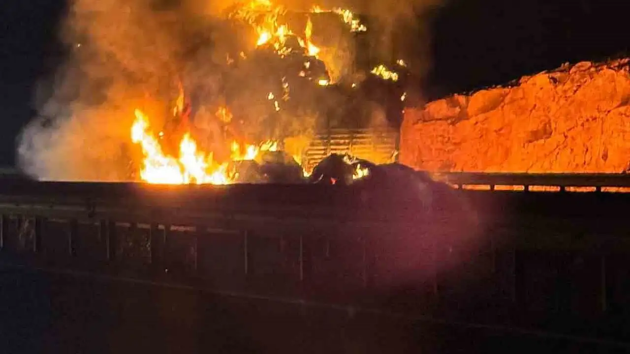 Şanlıurfa’da alev alan saman yüklü tır kullanılamaz hale geldi.
