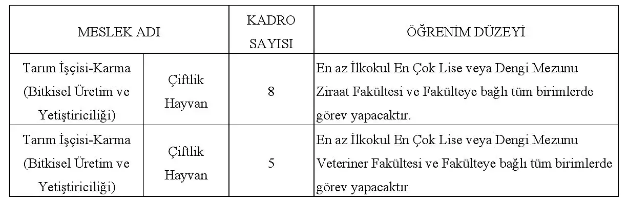 Sürekli İşçi kadroları ve başvuru şartları Türkiye İş Kurumu Genel Müdürlüğünün internet sitesinden yayımlanacak olup şartları uyan adayların başvuruları 27.10.2025-31.10.2025 tarihleri arasında İŞKUR İl Müdürlüklerinden/hizmet merkezlerinden veya www.iskur.gov.tr internet adresi üzerinden yapılacak.