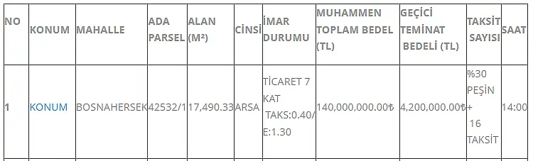 Bosna Hersek’te yer alan arsanın geçici teminat bedeli 4 milyon 200 bin TL iken, toplam bedeli 140 milyon TL olarak belirlendi.