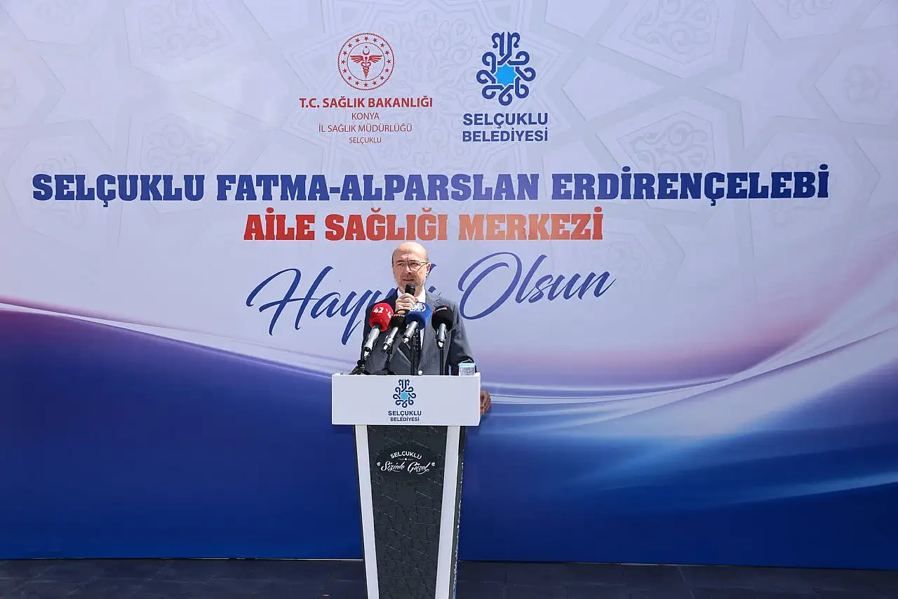 Örneğin Selçuklu ilçemizde 42 aile sağlığı merkezimizden 9 tanesini Selçuklu Belediye'miz inşa etmiştir. Hayırseverlerimiz olarak üçüncüsünü inşa etmiş bulunuyoruz ve toplamda 220 aile hekimliği biriminin 60'a yakınını belediyemiz ve hayırseverlerimizin inşa ettiği aile sağlık merkezlerimizde hizmet sunuyoruz. Bu çok önemli bir katkı. Tabii bakanlığımız da önemli oranda katkı sağlıyor ve bütün ilçelerimizde, 31 ilçemizde Halkapınar’dan Emirgazi'ye, Yunak'a kadar her bir ilçemizde hastane yatırımlarımız gayet güzel ve birinci basamak sağlık yatırımlarımız hiçbir ilçe ayırt edilmeden yapılıyor ve hizmeti dört dörtlük sunuluyor. Burada gerçekten Konya'mız Türkiye'ye örnek oluyor ve sağlık altyapımızı büyük oranda tamamlamış durumdayız. Tabii bu gönül birliğinde hayırseverlerimizin katkısı çok önemli. Alparslan, Erdirençelebi amcamız, eşi, oğulları Muammer Bey gerçekten çok büyük bir nezaket içinde bu hayırı gerçekleştirdiler ayrıca en kalbi teşekkürlerimi sunuyorum ve hepsine sağlıklı ömürler diliyorum. Tabii Konya adına örnek bir yapının ana ayaklarından biri de belediyelerimiz. Bu anlamda Selçuklu Belediyemiz bize çok büyük katkılar sağlıyor. Belediye Başkanımız Sayın Ahmet Pekyatırmacı bizleri hiçbir zaman geri çevirmiyor. Arsasından tutun binanın yapımına kadar, çevre düzenlemesine kadar ne istediysek hepsini yapıyor. Ayrıca bir tane koruyucu hastalıklar açısından önemli olan