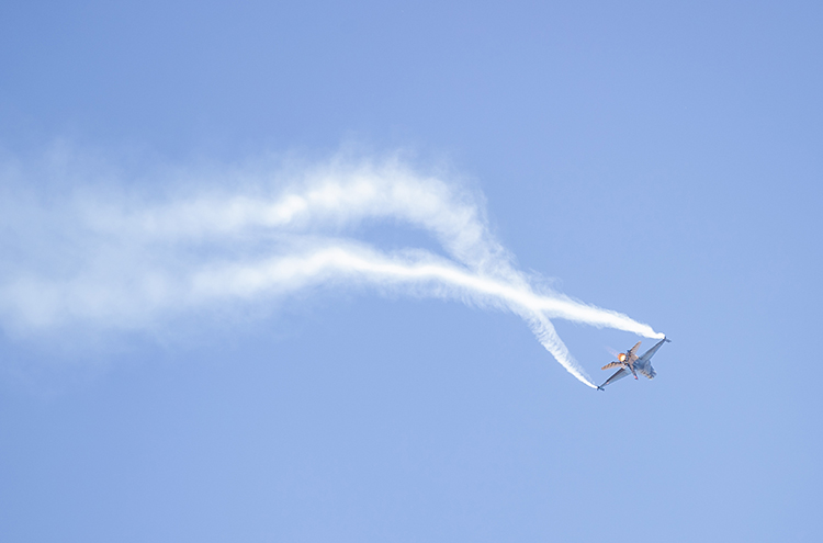 Prova uçuşunu izlemeye gelenler, SOLOTÜRK pilotunun F-16 savaş uçağıyla yaptığı akrobasi hareketlerini cep telefonlarıyla kaydetti.