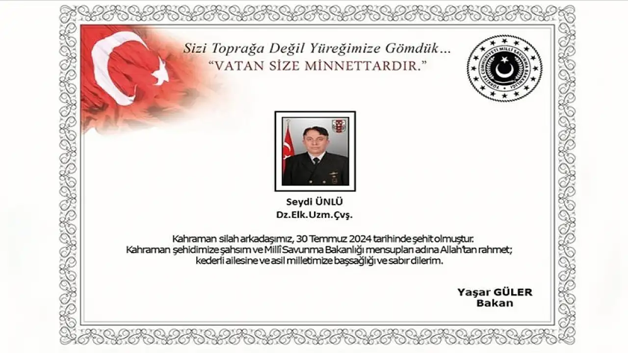 "Bizleri derin bir acı ve üzüntüye boğan bu olayda hayatını kaybeden aziz şehidimize Allah'tan rahmet, kederli ailesine, Türk Silahlı Kuvvetleri ile asil milletimize başsağlığı ve sabır dileriz."