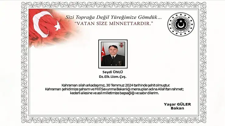 Bakanlıktan yapılan açıklamada, Uzman Çavuş Ünlü'nün dün geçirdiği kalp krizinin ardından hastaneye sevk edildiği ancak yapılan müdahaleye rağmen kurtarılamayarak şehit olduğu aktarıldı.