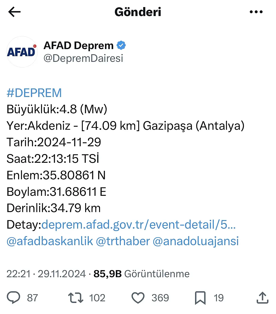 AFAD’ın yaptığı açıklamaya göre; 34km derinliğinde olan Antalya-Gazipaşa’da meydana gelen deprem Konya’dan hissedildi. Deprem çevre illerde panik oluşturdu.