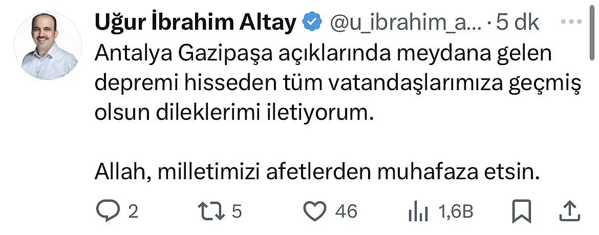 “Antalya Gazipaşa açıklarında meydana gelen depremi hisseden tüm vatandaşlarımıza geçmiş olsun dileklerimi iletiyorum.