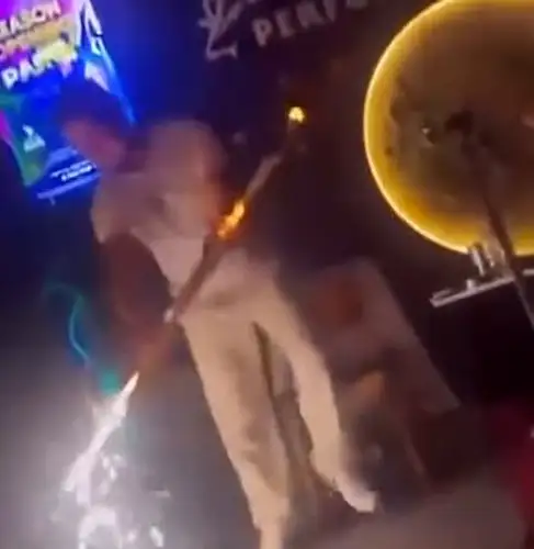 Görüntülerde; müzisyenin konfetiyi klarnetine koyması ve bir anda alev alması, konfetiyi çıkarması ve yardım etmeye çalışanlar yer alıyor.