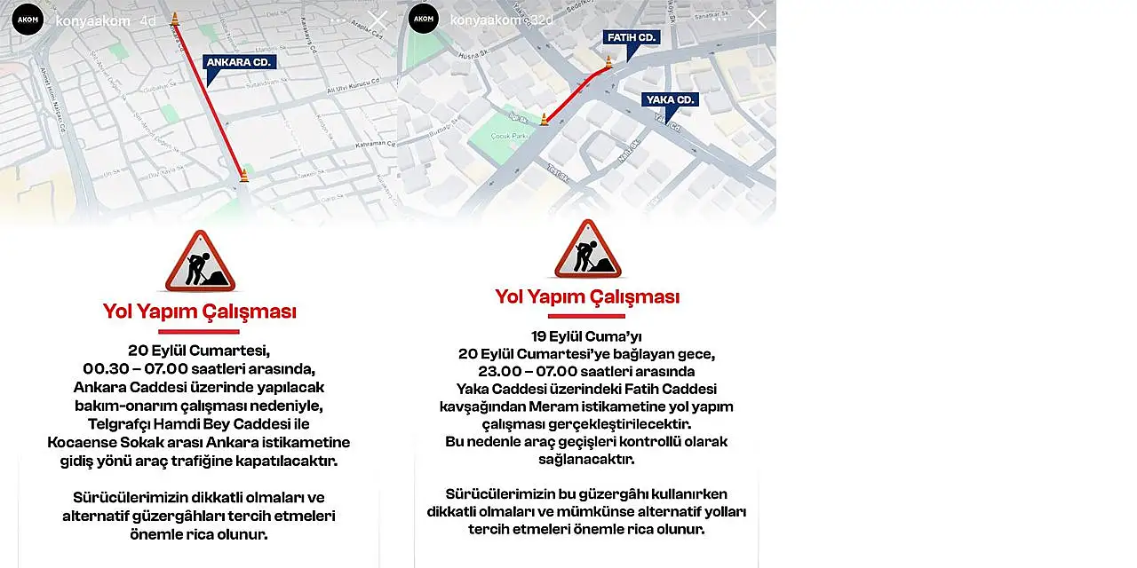 Konya Büyükşehir Belediyesi Afet Koordinasyon Merkezi (AKOM) Konya'da hafta sonu yapılacak 2 yol çalışmasını duyurdu.Hafta sonu iki farklı noktada gerçekleştirilecek çalışmalar nedeniyle trafik düzenlemeleri yapılacak.