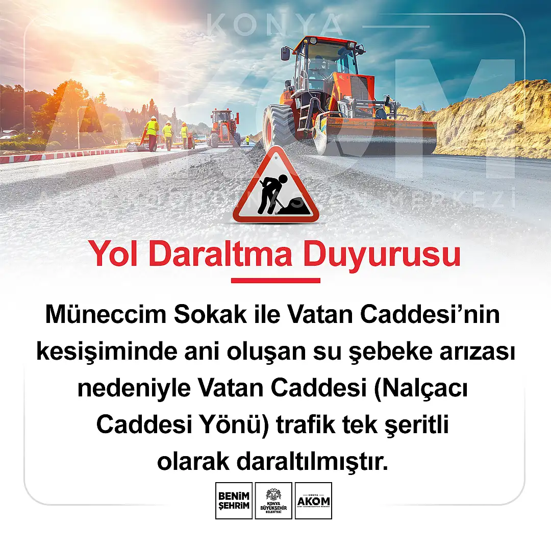 "Müneccim Sokak ile Vatan Caddesi’nin kesişiminde ani oluşan su şebeke arızası nedeniyle Vatan Caddesi (Nalçacı Caddesi Yönü) trafik tek şeritli olarak daraltılmıştır. Bu güzergahı kullanacak sürücülerimizin dikkatli seyretmeleri ve mümkünse alternatif yolları tercih etmeleri önemle rica olunur."
