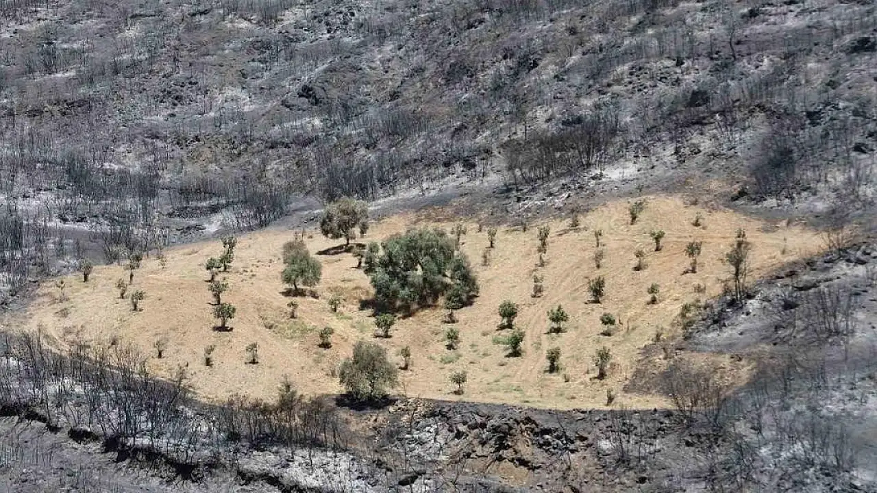 İzmir'in Ödemiş ilçesinde geçtiğimiz günlerde çıkan orman yangını, geniş bir alanı küle çevirirken, toprak adeta siyaha büründü. Yangın sonrasında oluşan simsiyah vadinin ortasında kalan zeytinlik bahçesinin ise alevlere geçit vermemesi dikkat çekti. Çevresi tamamen siyaha bürünen dağlık alanın ortasında kalan alan, toprağın sürülmesinin ve otlarının temizlenmesinin yangına karşı ne kadar etkili olduğunu bir kez daha ortaya koydu.