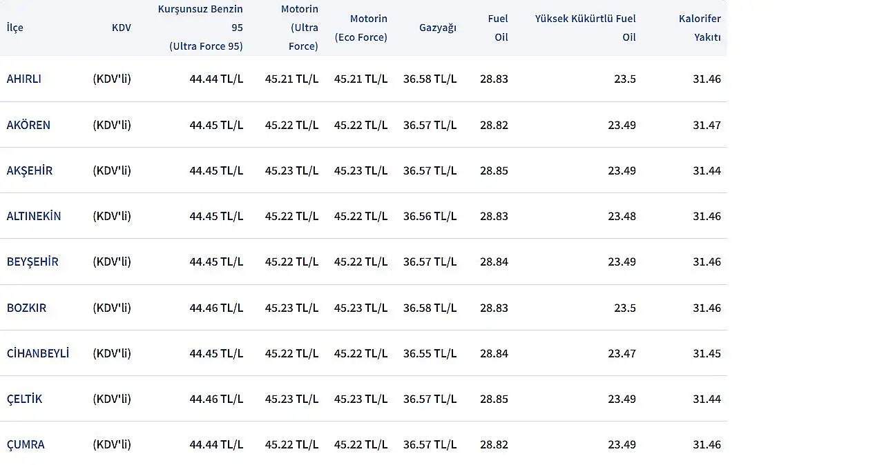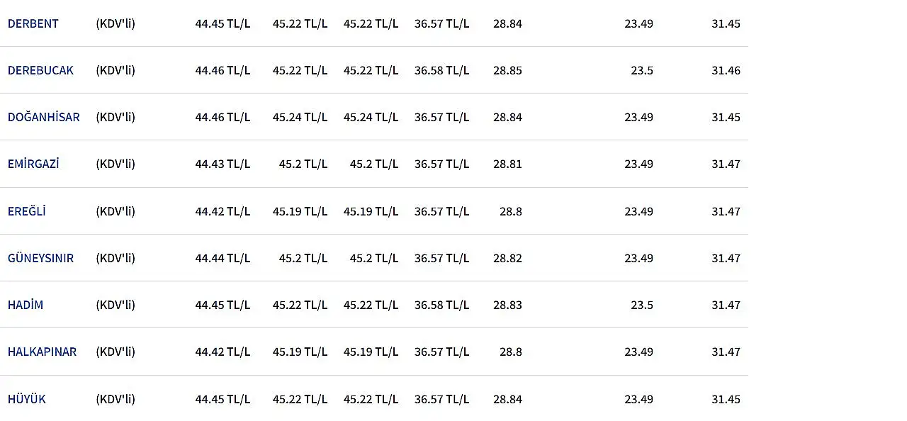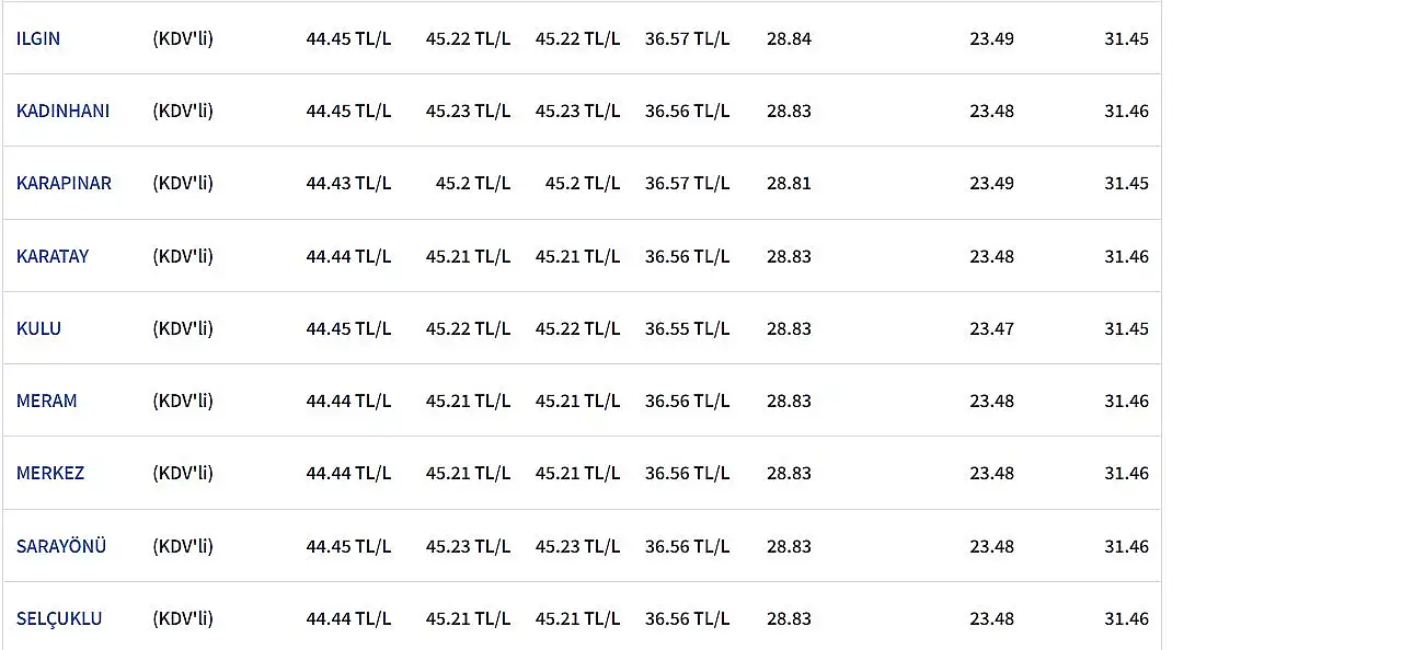 KONYA GÜNCEL AKARYAKIT FİYATLARI
