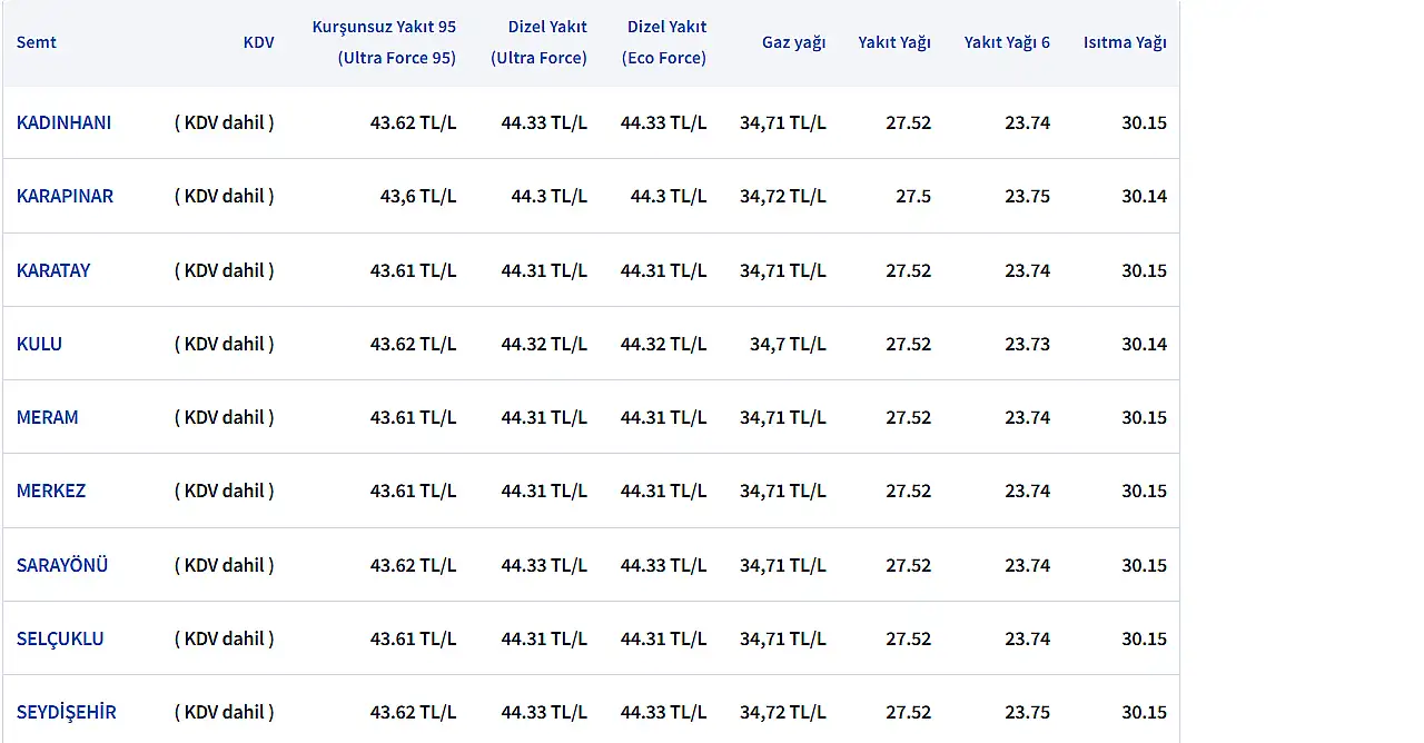 KONYA GÜNCEL AKARYAKIT FİYATLARI: