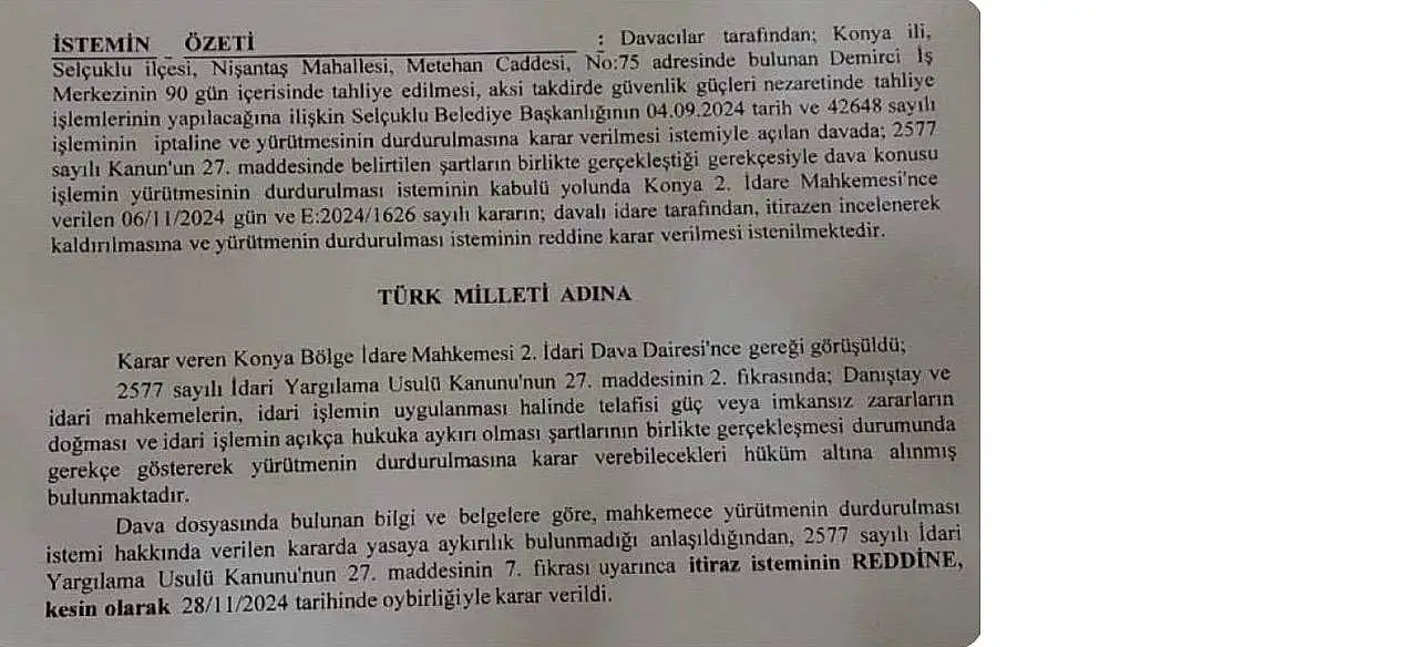 Davacılar tarafından; Konya ili, Selçuklu ilçesi, Nişantaş Mahallesi, Metehan Caddesi, No:75 adresinde bulunan Demirci İş Merkezinin 90 gün içerisinde tahliye edilmesi, aksi takdirde güvenlik güçleri nezaretinde tahliye işlemlerinin yapılacağına ilişkin Selçuklu Belediye Başkanlığının 04.09.2024 tarih ve 42648 sayılı işleminin iptaline ve yürütmesinin durdurulmasına karar verilmesi istemiyle açılan davada; 2577 sayılı Kanun'un 27. maddesinde belirtilen şartların birlikte gerçekleştiği gerekçesiyle dava konusu işlemin yürütmesinin durdurulması isteminin kabulü yolunda Konya 2. İdare Mahkemesi'nce verilen 06/11/2024 gün ve E:2024/1626 sayılı kararın; davalı idare tarafından, itirazen incelenerek kaldırılmasına ve yürütmenin durdurulması isteminin reddine karar verilmesi istenilmektedir.