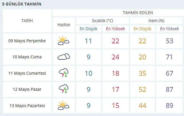 Tahminlere göre Konya’da hava sıcaklıkları 10-24 derece arasında değişecek. 9 Mayıs Perşembe gününde ise Konya merkez ve 31 ilçesinde parçalı bulutlu hava etkisini sürdürecek.