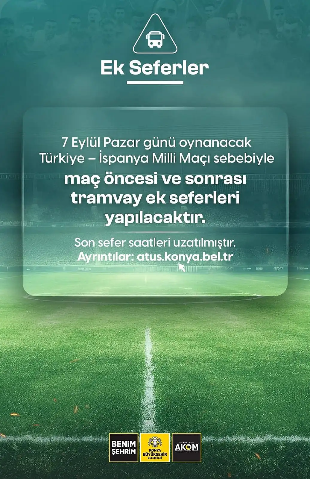 Konya’da 7 Eylül Pazar günü (bugün) oynanacak Türkiye – İspanya Milli Maçı için toplu ulaşımda ek seferler yapılacak. Konya Büyükşehir Belediyesi Afet Koordinasyon Merkezi (AKOM) tarafından yapılan açıklamada, taraftarların stadyuma rahat ulaşımı için otobüs ve tramvaylarda düzenlemeler gerçekleştirildiği bildirildi.