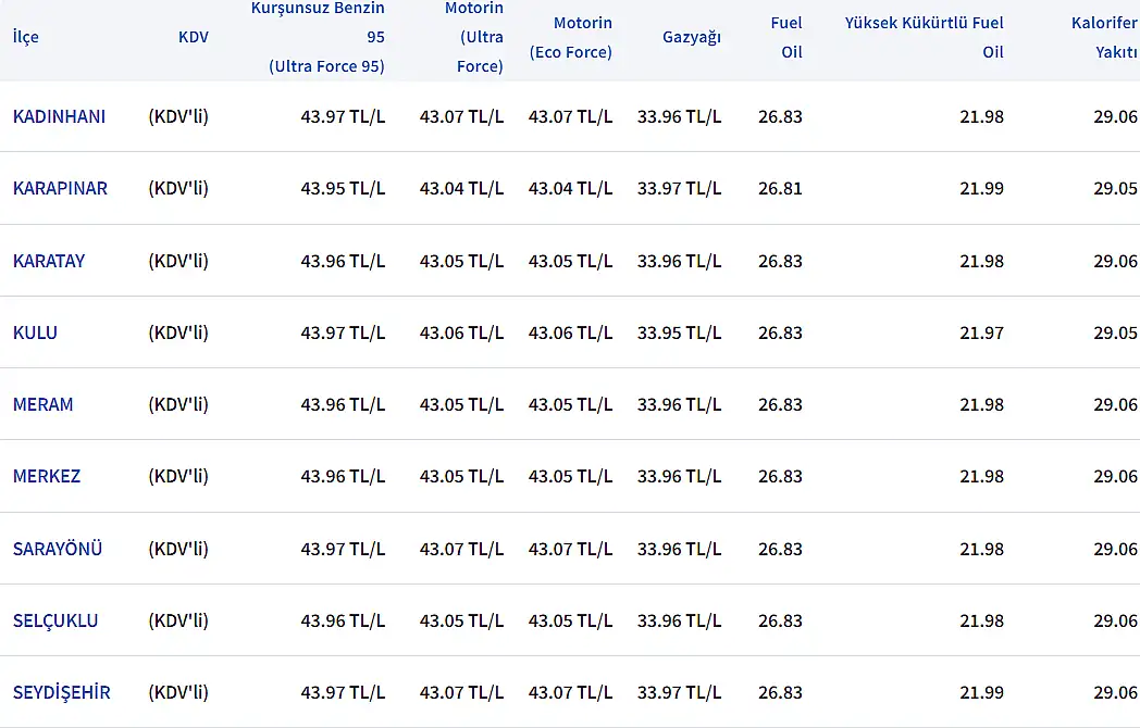 KONYA GÜNCEL AKARYAKIT FİYATLARI: