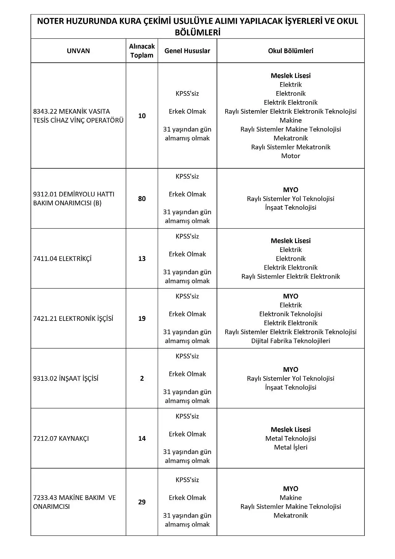 Türkiye Cumhuriyeti Devlet Demiryolları Genel Müdürlüğü işçi alımı ilanı, Resmi Gazete'de yayımlandı. TCDD iş yerlerinde belirsiz süreli iş sözleşmesiyle çalıştırılmak üzere noter huzurunda kurayla 346 ve sözlü sınavla 434 olmak üzere 780 işçi alımı yapılacak. Noter huzurunda kura çekimiyle vinç operatörü, demir yolu hattı, raylı sistemler sinyalizasyon ve makine bakım-onarımcısı, elektrikçi, kaynakçı, tezgah operatörü ve elektronik işçisi gibi görevler için alım gerçekleştirilecek.