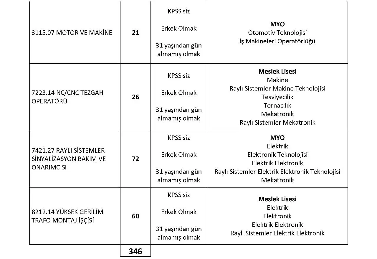 Sözlü sınavla da demir yolu yapım, bakım ve onarım makinesi operatörü, demir yolu ve yardımcı iş makineleri operatörü ve tren teşkil işçisi gibi görevler için alımda bulunulacak. İş gücü talepleri, 21 Kasım'a kadar çalışma adresine göre Türkiye İş Kurumunun (İŞKUR) internet adresinde (https://esube.iskur.gov.tr/) yayımlanacak. Adaylar, başvurularını yine İŞKUR üzerinden yapabilecek.