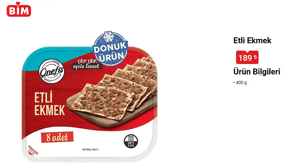 Dondurulmuş hazır ürünlere lahmacun, pide, börek ve pizzadan sonra etliekmekte eklendi. Konya'nın yöresel lezzeti etliekmek BİM’de satılmaya başlandı. Onefis markasının satışa sunduğu ‘Etliekmek’ pakete girdi. 8 dilim olarak satışa sunulan etliekmeği yemek için 180 derece fırında 6-8 dakika ısıtmak yeterli oluyor.