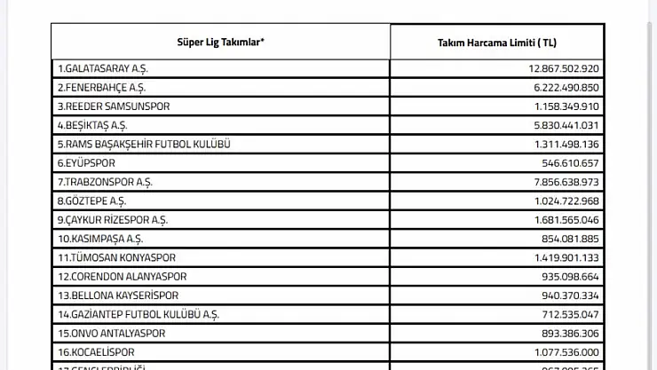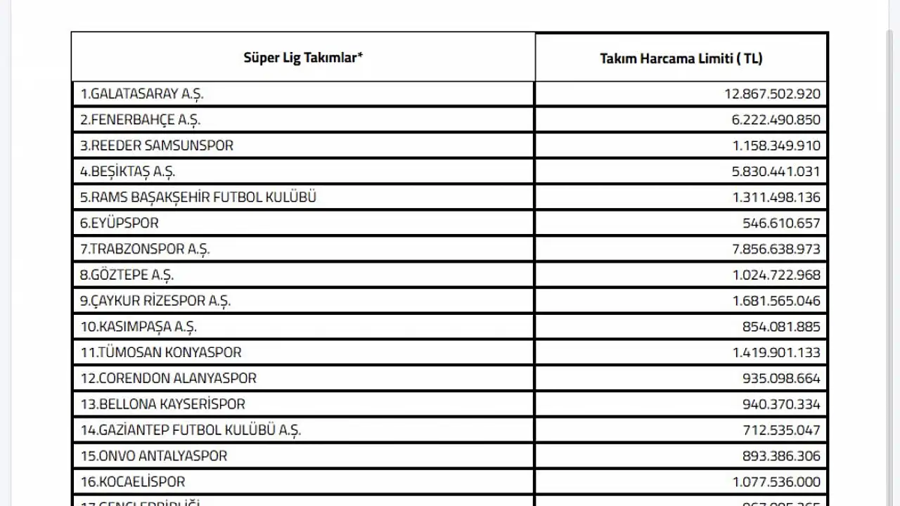 TFF'denn yapılan açıklamada; "30 Aralık 2022 tarihinde yürürlüğe giren Kulüp Lisans ve Finansal Sürdürülebilirlik Talimatı'nın 121. Maddesi kapsamında, Ek XIII'de yer alan usullerle belirlenen Süper Lig Takım Harcama Limitleri şu şekilde hesaplandı: Kulüp Lisans ve Finansal Sürdürülebilirlik Talimatının EK XIII D Maddesinde belirtildiği üzere, Kulüp Lisans ve Finansal Sürdürülebilirlik Talimatı EK XIII/D bendine göre T sezonunda Süper Lig'de yer almamış kulüplerin profesyonel futbol takımı harcama limitleri T sezonunu Süper Lig'i 7-15 sıralarında tamamlamış kulüpler için T+1 sezonu için onaylanan Takım Harcama Limitlerinin (harcama tutarı en yüksek ve en düşük takım dahil edilmeyerek) ortalaması alınmak sureti ile hesaplanacağı belirtilmiştir. Kulüp Lisans ve Finansal Sürdürülebilirlik Talimatı' nın EK XIII E Maddesinde belirtildiği üzere, Kulüpler için belirlenen takım harcama limitleri belirtilen gerekçeler ve usullerle, 15 Aralık tarihine kadar yapılacak başvurular ve her iki transfer ve tescil döneminin son günü en geç saat 18.00'e kadar yapılacak başvurular üzerine Kulüp Lisans Kurulu tarafından artırılabilir. Sıralama, 2024-2025 Sezonu Süper Lig sezon sonu puan durumuna göre düzenlenmiştir" denildi.