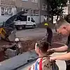 Bursa'da berberini ikna eden vatandaş, kaldırım üzerinde tıraş olurken yol yapım çalışmasını izledi.