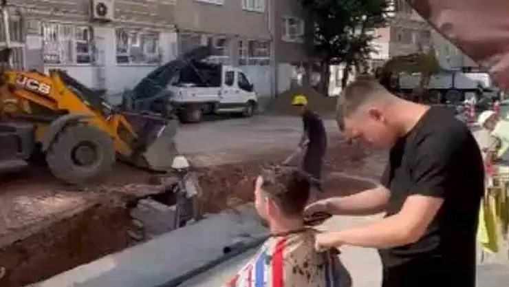 Osmangazi ilçesi Gülbahçe Mahallesi'nde tıraş olan bir vatandaş, yol yapım çalışması izlemek için koltuğu dışarıya çıkardı. Berberini de ikna eden vatandaş, kaldırım üzerinde hem tıraş oldu hem de yol yapım çalışmasını izledi. O ilginç anlar çevrede bulunan bir vatandaş tarafından kaydedildi.
