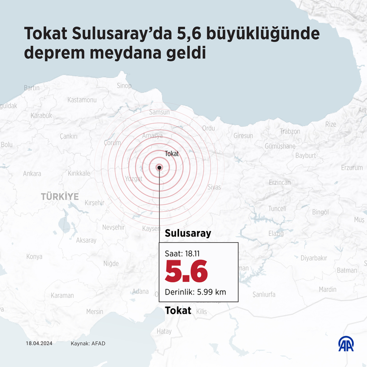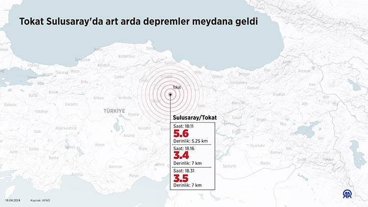 AFAD'dan yapılan açıklamada, saat 18.11'de Tokat'ın Sulusaray ilçesinde 5,6 büyüklüğünde deprem meydana geldiği anımsatıldı.