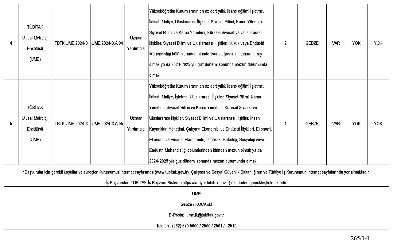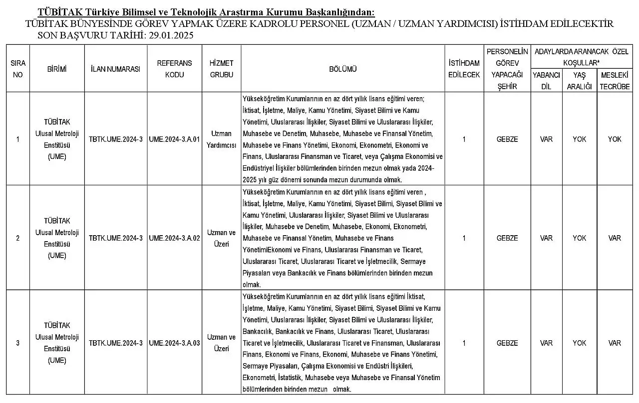 Kurumun Resmi Gazete'de yayımlanan ilanına göre, TÜBİTAK Ulusal Metroloji Enstitüsü (UME) bünyesinde görev yapmak üzere 6 uzman ve uzman yardımcısı alımı yapılacak.