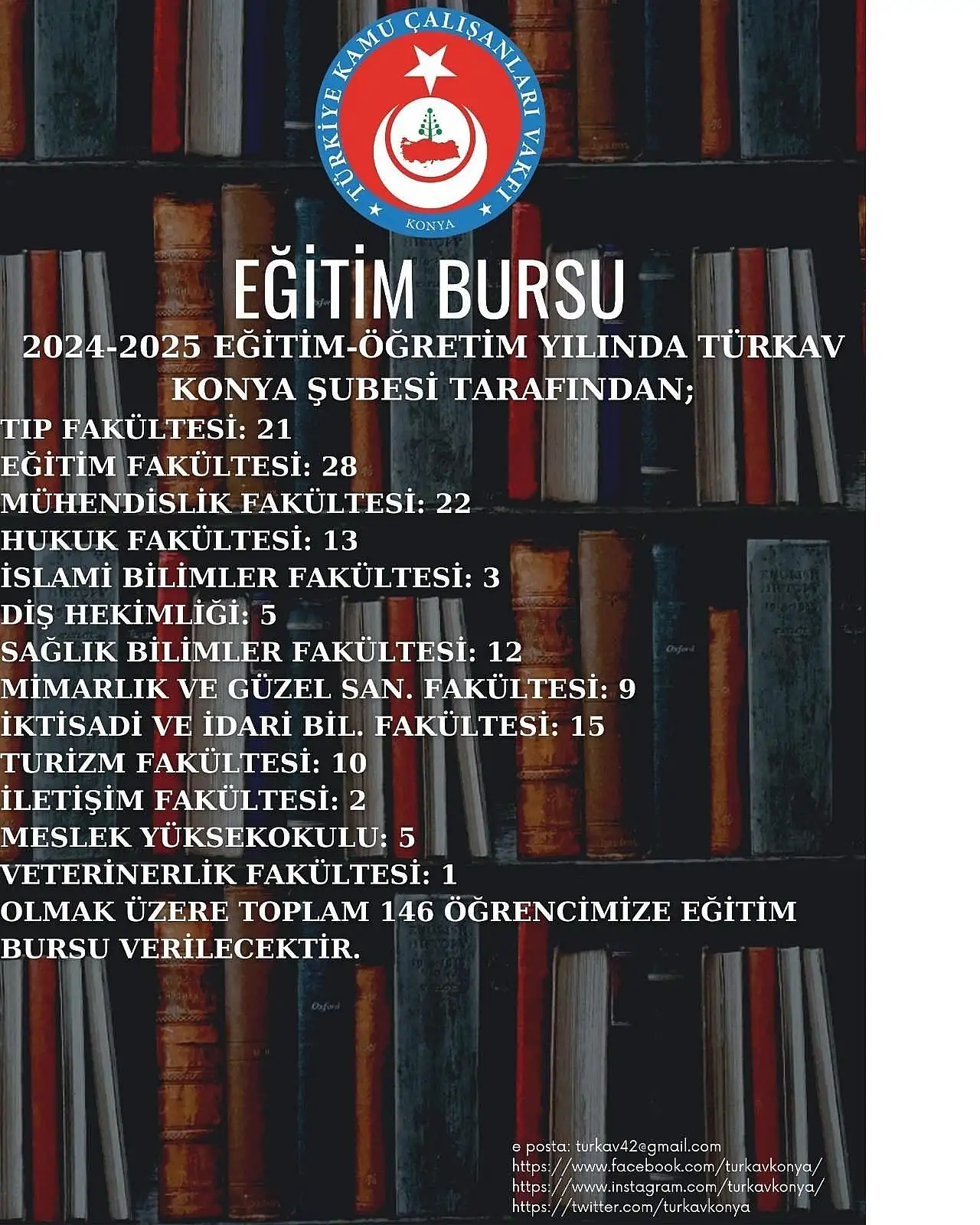 TÜRKAV Konya Şubesi olarak 2005 yılında başladığımız Eğitim Bursu projemizin amacı Konya da öğrenim gören ihtiyaç sahibi üniversite öğrencilerine bir miktar katkıda bulunabilmektir.2005 yılında 2 öğrenci ile başladığımız burs sayısı bugün 146 öğrenciye ulaşmıştır.Sayının artmasında en önemli husus ise hayırsever vatandaşlarımızın Vakfımıza olan güvenidir. Bu güven ortamının oluşmasını sağlayan önceki dönem Şube Başkanlarımıza teşekkür ederim. Geleceğimizin teminatı olan gençlerimize sahip çıkmak onlara yardımcı olabilmek bize mutluluk vermektedir.2024-2025 Eğitim-Öğretim yılında da 146 öğrenciye burs verilmesine vesile olan, katkıda bulunan tüm hayırseverlere ve emeği geçen herkese teşekkür ediyorum