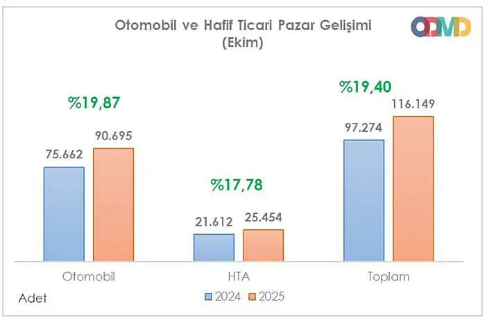 Sadece Ekim ayında otomotiv pazarı yüzde 20 büyüyerek 116 bin 149 adet satışa ulaştı. Bu satışların 90 bin 695’i otomobil, 25 bin 454’ü ise hafif ticari araçlardan oluştu. Pazarın büyüklüğü, son 10 yılın ortalamasının yüzde 60 üzerinde gerçekleşti.