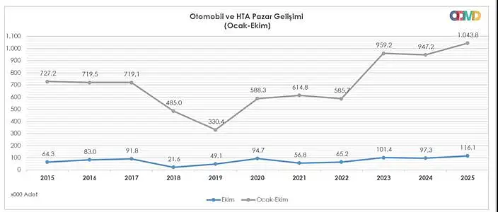Otomotiv Distribütörleri ve Mobilite Derneği'nin (ODMD) verilerine göre, Türkiye otomotiv pazarı tarihi bir dönemeçten geçiyor.Otomobil ve hafif ticari araç satışları, 2025 yılının bitmesine sayılı aylar kala rekor üstüne rekor kırıyor.