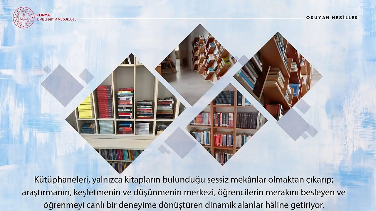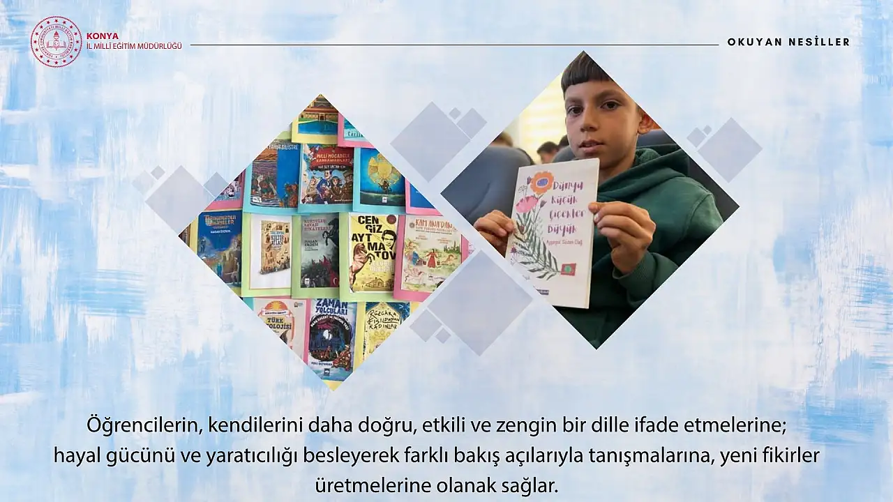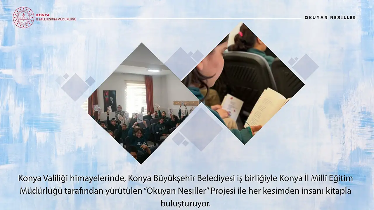 Türkiye Yüzyılı Maarif Modeli doğrultusunda, Konya Valiliği himayelerinde, Konya İl Milli Eğitim Müdürlüğü ve Konya Büyükşehir Belediyesi iş birliğiyle Kasım 2025'te hayata geçirilen Okuyan Nesiller Projesi, öğrencilerden velilere uzanan bir okuma kültürünü oluşturmaya devam ediyor.