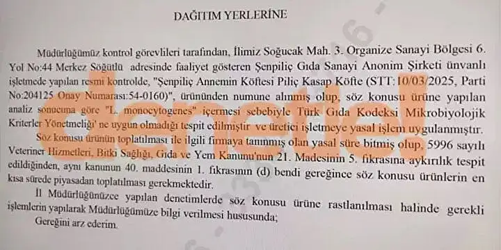 "Müdürlüğümüz kontrol görevlileri tarafından, İlimiz Soğucak Mah. 3. Organize Sanayi Bölgesi 6. Yol No:44 Merkez Söğütlü adresinde faaliyet gösteren Şenpiliç Gıda Sanayi Anonim Şirketi unvanlı işletmede yapılan resmi kontrolde "Şenpiliç Annemin Köftesi Piliç Kasap Köfte" (STT 10/03/2025 - Parti no: 204124) ürününden numune alınmış olup, söz konusu ürüne yapılan analiz sonucuna göre 'L. monocytogenes' içermesi sebebiyle Türk Gıda Kodeksi Mikrobiyolojik Kriterler Yönetmeliği'ne uygun olmadığı tespit edilmiştir ve üretici işletmeye yasal işlem uygulanmıştır.