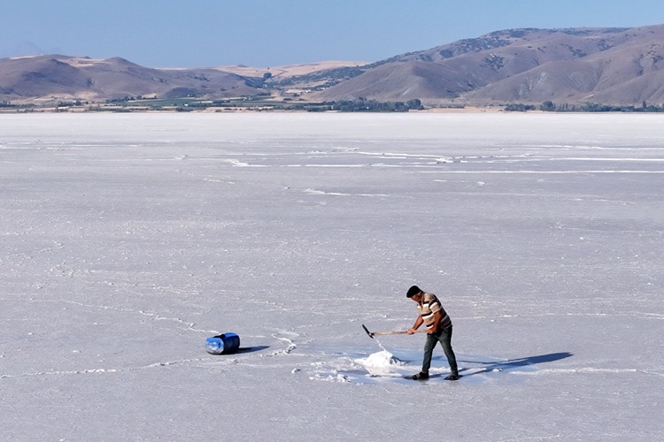 Günlük ortalama 10 torba tuz çıkardığını dile getiren Gökkurt, hava ısınınca ara verip gün batımına yakın tekrardan göle geldiğini anlattı.
