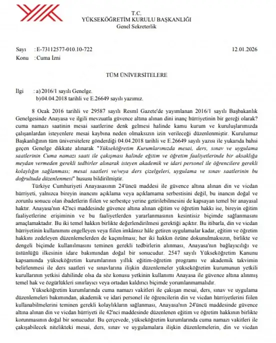 Yükseköğretim kurumlarında cuma namazı vakitleri ile çakışan mesai, ders, sınav ve uygulama düzenlemeleri bakımından, akademik ve idari personel ile öğrencilerin din ve vicdan hürriyetlerini fiilen kullanabilmelerini teminen gerekli kolaylıkların sağlanması, Anayasa'nın 24'üncü maddesinde güvence altına alınan din ve vicdan hürriyeti ile 42'nci maddesinde düzenlenen eğitim ve öğretim hakkının birlikte korunmasının doğal bir sonucudur. Bu çerçevede, yükseköğretim kurumlarında cuma namazı vakitleri ile çakışabilecek nitelikteki mesai, ders, sınav ve uygulamalara ilişkin düzenlemelerin, din ve vicdan hürriyetini fiili kullanımını ve eğitim-öğretim faaliyetlerinin sürekliliğini birlikte gözeten bir yaklaşımla yeniden değerlendirilmesi; söz konusu faaliyetlerin, cuma namazı saatlerinde yerine getirilecek ibadetleri aksatmayacak şekilde planlanması ve gerekli idari tedbirlerin alınması hususunda gereğini rica ederim.