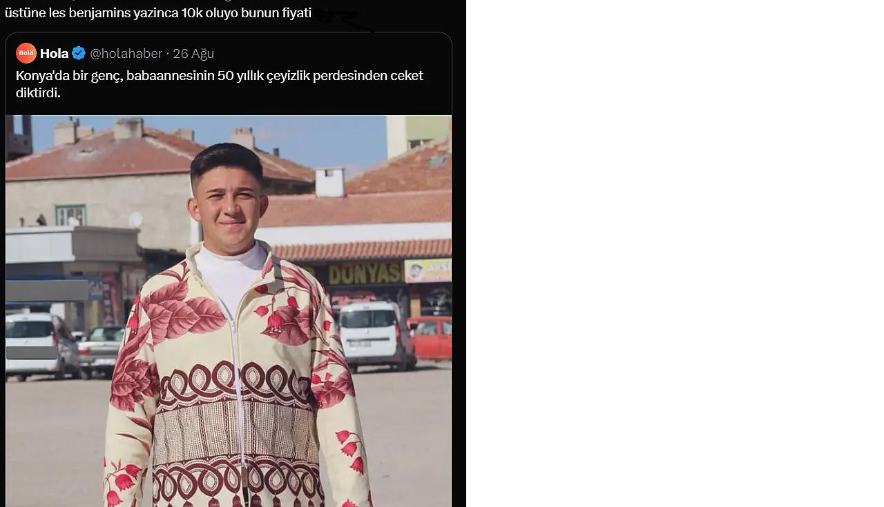 Konya'da bir genç, babaannesinin 50 yıllık çeyizlik perdesini modaya uyarlayarak dikkat çeken bir ceket yaptırdı.İlginç tasarımıyla sosyal medyada gündem olan genç, paylaşımların ardından büyük ilgi gördü.