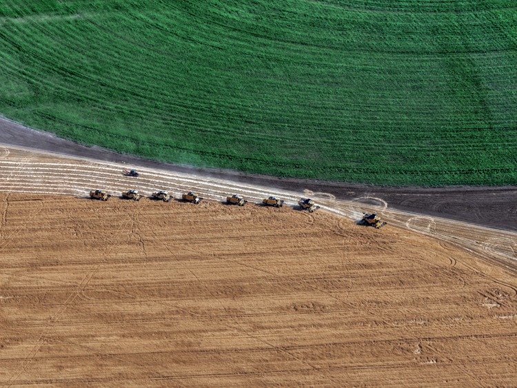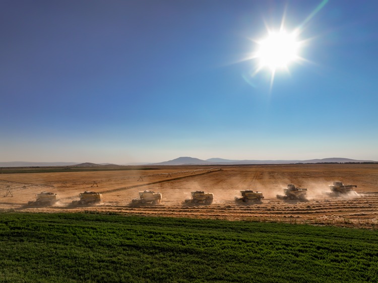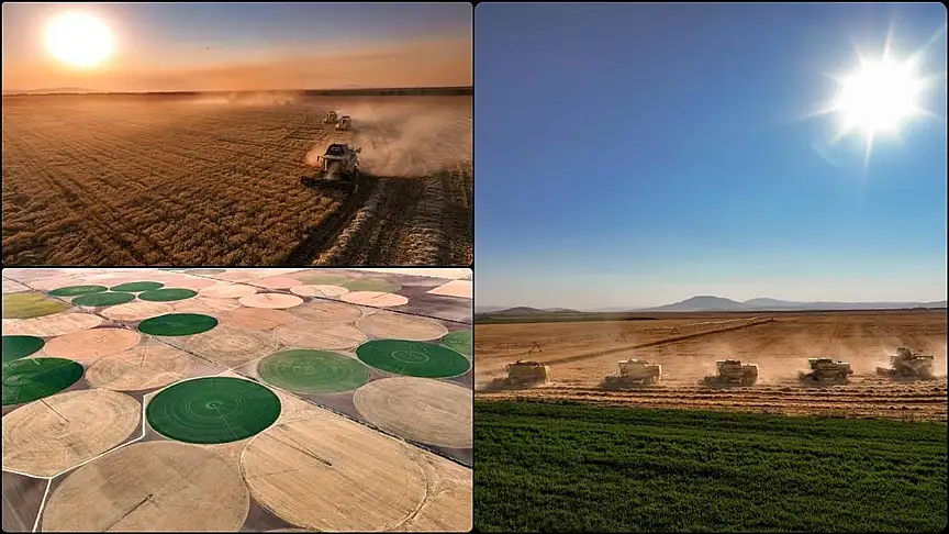 Tarlanın merkezini esas alan, yarı çap uzunluğundaki hareketli robotik sulama sistemine göre ekimin yapıldığı 492 dekarlık dairesel tarlalarda hasat, çok sayıda biçerdöverle gerçekleştirildi.