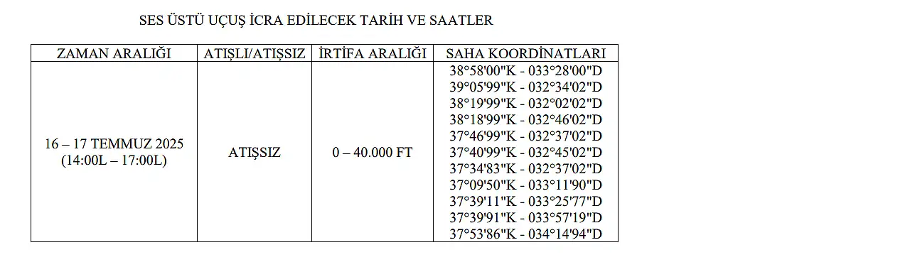 Konya Valiliği daha önce 3. Ana Jet Üssü'nde gerçekleştirilen tatbikatlar sonucunda meydana gelen sonic patlamalar sonrası endişeye kapılan Konyalıları 16-17 Temmuz tarihlerinde 14.00-17.00 saat aralığında 3’üncü Ana Jet Üs Komutanlığı 132’nci Silah ve Taktikler Filo Komutanlığı tarafından benzetilmiş harekât ortamında Çok Uçaklı Görevler ve Harbe Hazırlığın Devamı Eğitimi kapsamında ses üstü uçuş icra edileceğini duyurdu.