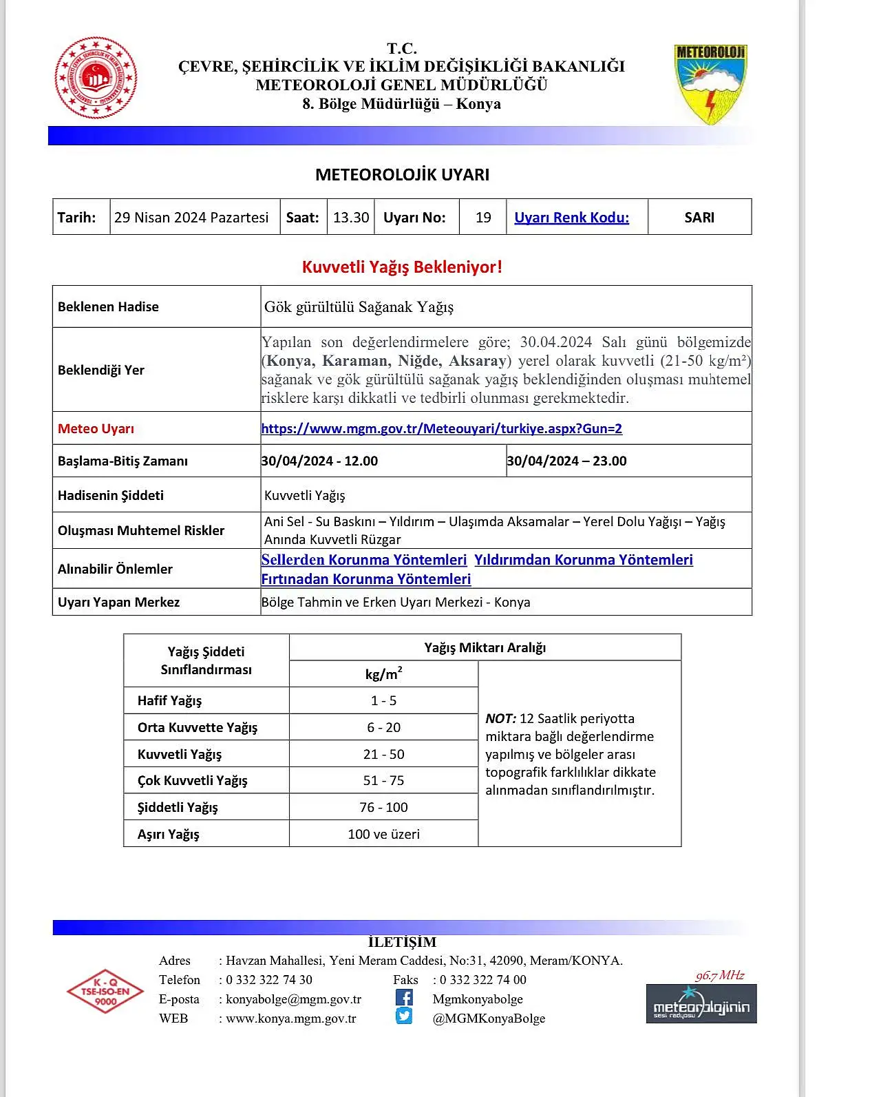 - Valilikten Sarı Kodlu Uyarı! Konyalıların Tedbirli Olması Gerekiyor!