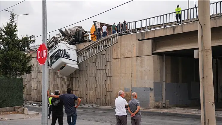 İrfan Öngen (48) idaresindeki 06 FGT 332 plakalı tır, Ankara Caddesi 4. Sanayi Kavşağı'nda seyir halindeyken sürücüsünün kontrolünü kaybetmesi sonucu devrildi. Sürüklenen tır, viyadükte asılı kaldı.