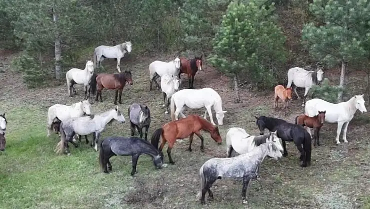 Kütahya'nın Tavşanlı ilçesindeki Şevki Şimşek Yaylacık Ormanı'nda yaşayan atlar, drone ile yavruları ile görüntüledi.