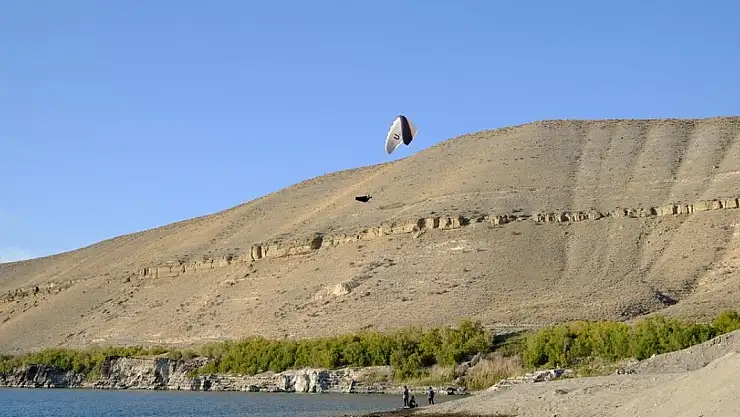 Karapınar Uçuş ve Doğa Sporları Kulübü'ne bağlı olarak eğitim uçuşu yapan pilotlar, sıcak havalarda bir süre gökyüzünde süzüldükten sonra göle inerek serinliyor.Havadan süzülen paraşütçülerin göle iniş performanslarını göl kenarına gelen ilçe sakinleri de