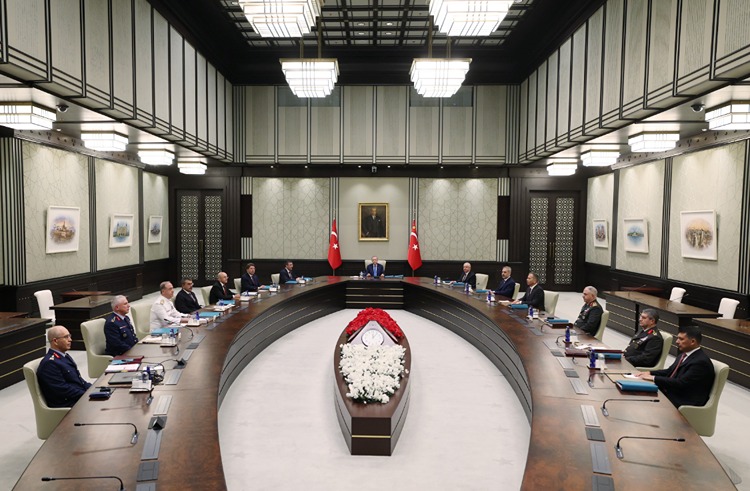 Cumhurbaşkanı Erdoğan, Şura kararlarını imzalarken Cumhurbaşkanı Yardımcısı Cevdet Yılmaz ve Milli Savunma Bakanı Yaşar Güler de hazır bulundu.