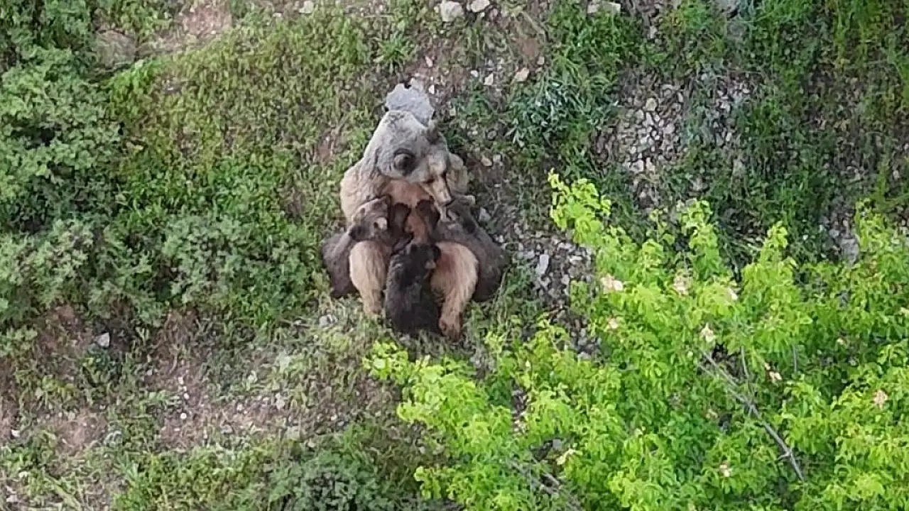 Tunceli'de dağlık alanda üç yavrusunu emziren yavru ayı dron ile kayıt altına alındı. Yavrularının karnını doyuran ayı daha sonra dağlık alana giderek gözden kayboldu.
