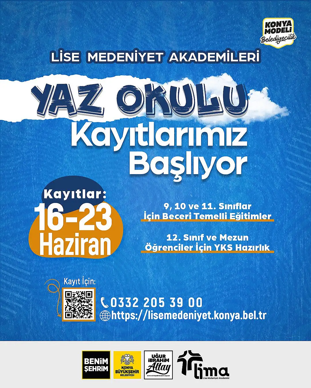 Konya Büyükşehir Belediyesi tarafından Lise Medeniyet Akademileri bünyesinde düzenlenen Yaz Okulu programı için kayıtlar başlıyor.16-23 Haziran tarihleri arasında yapılacak kayıtlarla, Konya'daki 9, 10 ve 11.