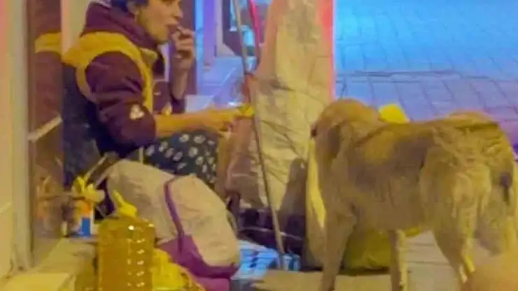 Yemeğini sokak köpeği ile paylaşan kadın yürekleri ısıttı