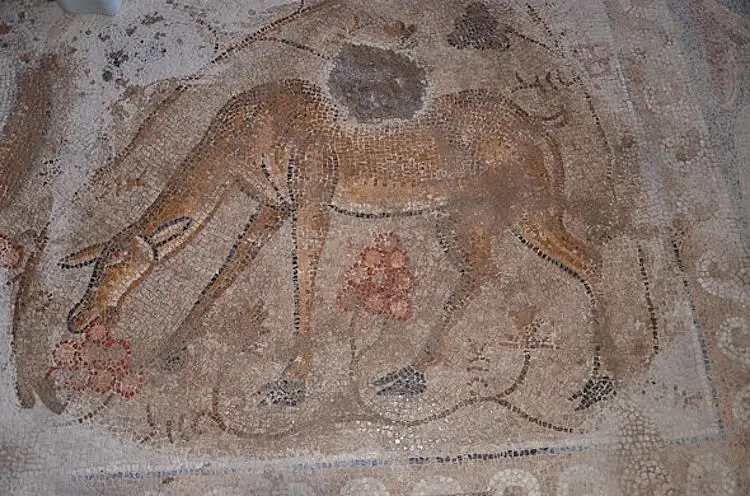 Büyük boyutlardaki mozaiğin merkezinde aslanla savaşan mızraklı bir savaşçı, ortasında büyük bir vazo ve vazodan çıkan kuru dallar bulunuyor. Kenarlarda dalga motifleri, balıklar, bereketi simgeleyen nar öne çıkıyor. Vazonun hemen sağında ve solunda dağ keçileri ve ceylanlar üst tarafında bir keklik, hemen yanında ise kafesli bir akbaba kuşu ve iki tane aslan olduğu anlaşılıyor.