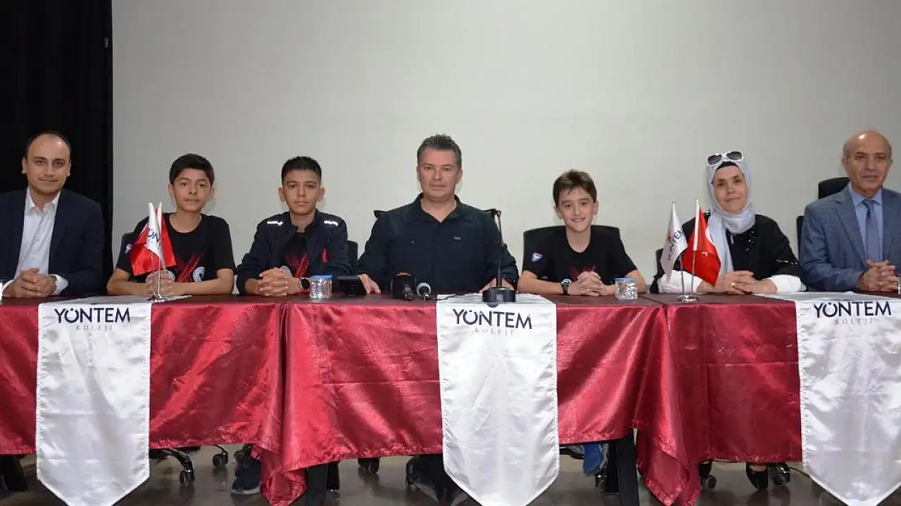 Yöntemli öğrencilerinin Teknofest’e Türkiye birincileri olması nedeniyle Yöntem Eğitim Kurumları’nın Selçuklu Yerleşkesi’nde düzenlenen basın toplantısına Fen Bilimleri Öğretmeni ve Yöntem Eğitim Kurumları Yönetim Kurulu Üyesi Serdar Akar, Yöntem Koleji Teknofest Danışmanı Nursun Kurt, Yöntem Selçuklu Yerleşkesi Müdürü Musa Gezgin, Yöntem Meram Yerleşkesi Müdür Yardımcısı Ömer Sofuoğlu, Teknofest’te Türkiye Birincileri olan Kemal Kerem Aydın, Alptuğ Gürcan ve Buğrahan Aytek katıldı.