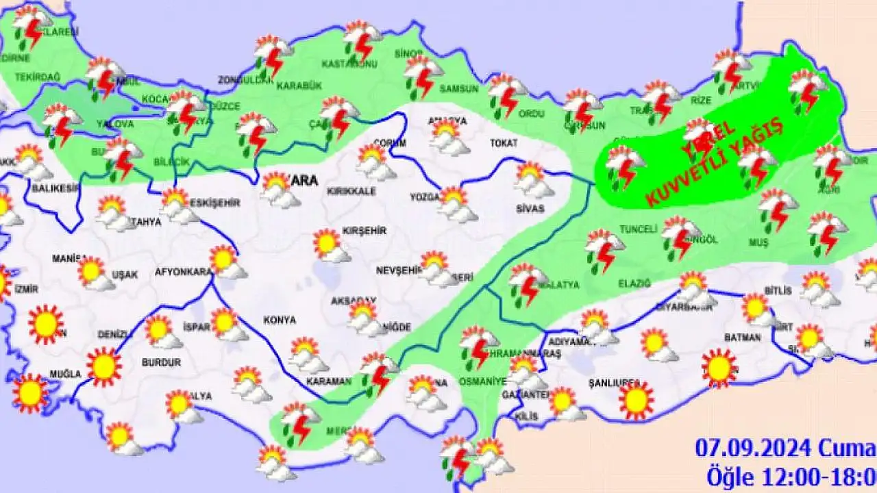 Meteoroloji Genel Müdürlüğü tarafından yapılan son tahminlere göre yurdun kuzey ve iç kesimlerinin parçalı yer yer çok bulutlu, Marmara’nın kuzey ve doğusu, Batı ve Doğu Karadeniz, Orta Karadeniz kıyıları, Doğu Anadolu’nun kuzey ve batısı, Hatay, Kahramanmaraş, Osmaniye, Çankırı çevreleri, Ankara’nın kuzey kesimleri ile Doğu Akdeniz’in Toroslar kesiminin yerel olmak üzere sağanak ve gök gürültülü sağanak geçişleri, diğer yerlerin az bulutlu ve açık geçeceği tahmin ediliyor.